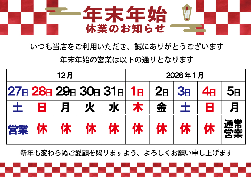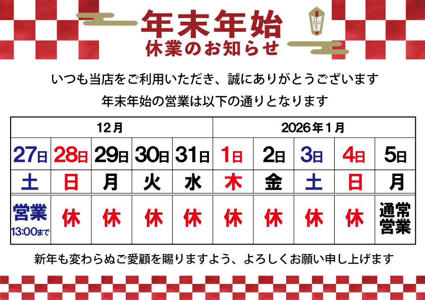 店舗:年末年始休業のお知らせ
